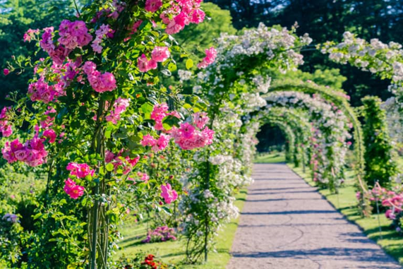 Aquí pots passejar per nombrosos arcs de roses, des que broten les roses de color rosa i vermell, o asseure’s als bancs en mig de l’esplendor de les flors i gaudir de la seva fragància.