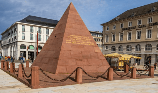 El monument de Karlsruhe està situat a la plaça més famosa de la ciutat, on també es troba l’Ajuntament i l’església de la ciutat. Es tracta d’una piràmide de quasi 7 metres d’altura feta de gres, que es va erigir al 1823 sobre les restes de la Konkordienkirche. Marca el lloc de l’enterrament del fundador de la ciutat, el margrave Karl Wilhelm von Baden-Durlach.