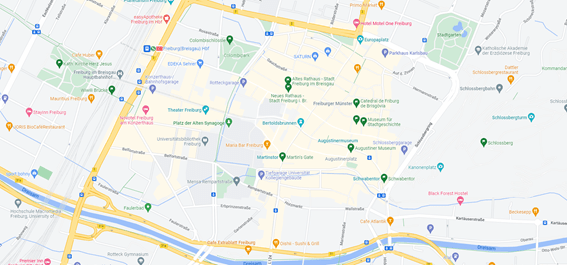Perdent-se pel casc antic es poden veure edificis molt ben conservats, els carrers són de vianants (amb l’excepció del pas del tramvia). Del centre de Friburg destaquen les llambordes amb mosaics, l’autor d’això va ser Alois Krems, que va tenir la inspiració durant el temps d’aprenent al sud de França. Els carrers va ser pavimentats amb basalt i vetes de marbre blanc entre 1901 i 1911.